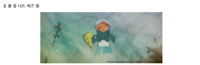 SF 애니메이션 〈올 유 니드 이즈 킬〉은 같은 원작을 영화로 옮긴 톰 크루즈 주연 <엣지 오브 투모로우>와 달리 리타의 시점을 전면에 내세워 긴장감을 새롭게 펼친다. 거대한 외계 식물 ‘다롤’이 지구를 위협하는 가까운 미래, 리타는 끝없는 죽음과 부활의 루프 속에서 서사의 중심으로 떠오른다. 2026년 1월 9일 일본 현지 개봉하는 신작. 아키모토 켄이치로의 작품 소개가 상영 전에 있다.