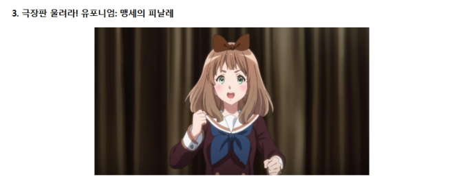 유포니엄 최초 완전 극장용 애니메이션으로, 작화와 연출 모두 최고 수준의 완성도를 자랑한다. 무엇보다 쿠미코의 성장과 내면에 더욱 집중함으로써 한층 응집력있는 이야기를 펼쳐낸다. 관악부의 변화 역시 새로운 시선으로 풀어내며, 팀과 주인공이 얼마나 성숙해졌는지를 효과적으로 보여준다. 시련 속에서도 끝내 성장하는 쿠미코의 모습은, 시리즈와 함께 걸어온 관객들에게 깊은 울림과 감동을 남긴다.