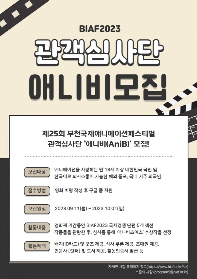제25회 부천국제애니메이션페스티벌(BIAF2023)은 9월 11일(월)부터 10월 1일(일)까지 ‘최애의 애니’를 선정하는 관객심사단 ’애니비(AniB)’를 모집한다. 만 18세 이상 한국어로 의사소통이 가능하면 누구나 지원 가능하다.
