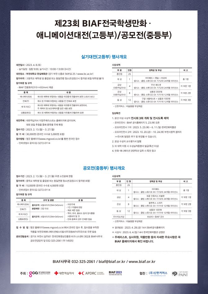 제23회 BIAF전국학생만화 · 애니메이션 대전은 전국 고등학교 재학생 및 졸업생 또는 동일연령 청소년이라면 누구나 참여할 수 있다. 특히 언텍트 실기대회에서 전환하여 3년 만에 오프라인으로 진행되는 실기대전으로 장소는 4월 8일 부천대학교에서 진행된다. 참가부문은 애니메이션, 만화, 캐릭터, 상황표현 4개의 부문이며, 2월 13일(월)부터 3월 27일(월)까지 엠굿 홈페이지(www.mgood.co.kr)를 통해 온라인 접수가 가능하다. 작년 공동 주최를 진행한 ‘대한적십자사’는 올해도 대한적십자사상(금상, 은상)을 시상한다. 본상 수상자에게는 교수평가서가 발행되어 향후 대학 진학에 실질적인 도움을 받을 수 있다.