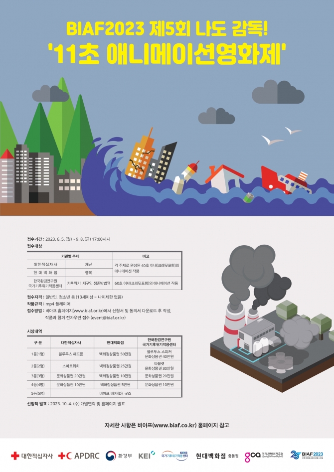 제25회 부천국제애니메이션페스티벌(이하 BIAF2023)이 대한적십자사, 현대백화점, 한국환경연구원과 함께 주최하는 제5회 나도 감독! ‘11초 애니메이션영화제’ 출품 공모를 6월 5일(월)부터 모집한다.
