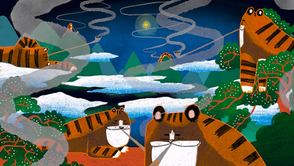 When the star sneezes at the smoke and falls from the heavens, darkness shrouds the valley. The startled tigers gather under their leader, who rallies them to embark on a quest to restore the lost light. Carrying Korean paper lanterns, they set out—save for one mischievous tiger who tries to sneak along his pipe, only to be humorously reprimanded.