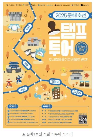‘문화1호선 스탬프 투어’는 부평, 부천, 영등포, 수원, 의정부 등 5개 문화도시가 협력해 수도권 1호선의 역사와 지역 문화를 재해석하고, 시민들이 일상 속에서 문화를 즐길 수 있도록 기획된 공동사업이다. 올해는 각 도시의 대표 축제와 연계한 형태로 스탬프 투어가 진행되며, 부천시에서는 BIAF와 함께하는 특별 연계프로그램으로 운영된다.